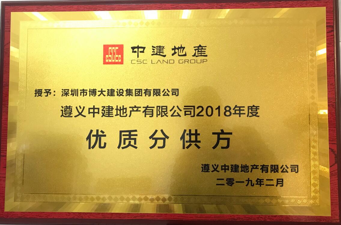博大建設(shè)集團(tuán)秉承“讓顧客有幸福感”的企業(yè)魂,與遵義中建地產(chǎn)建立起良好的戰(zhàn)略合作關(guān)系,保安全、保質(zhì)量、保工期、保服務(wù)、守合同,以優(yōu)秀成果獲得客戶的高度認(rèn)可,榮獲遵義中建地產(chǎn)2018年度“優(yōu)質(zhì)分供方”。